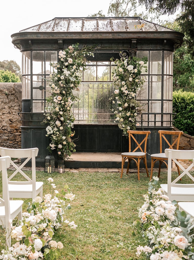 Arche fleurie, allée nuptiale, bancs décorés… Un décor enchanteur pour un moment magique.